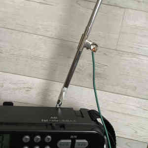 ラジオ本体のアンテナに目玉クリップを挟み込んで、先ほど求めた数式に基づいた長さだけリード線を任意の方向へ伸ばす。